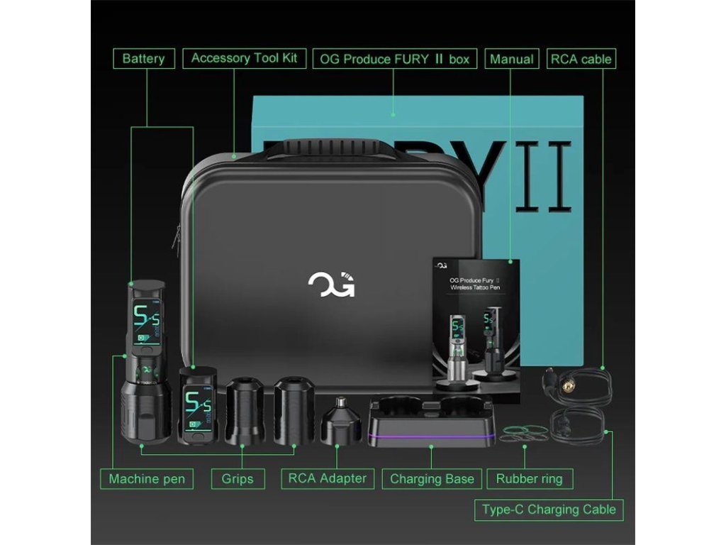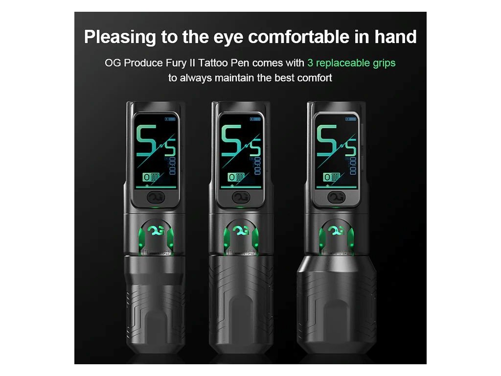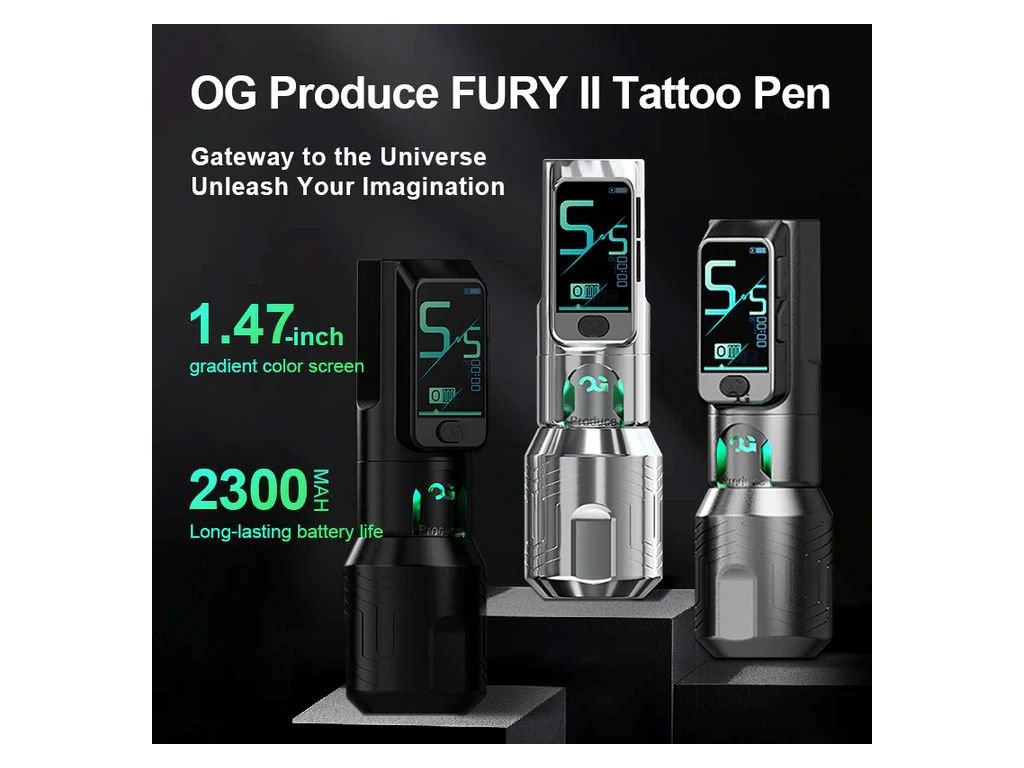 OG Produce FURY II Wireless tattoo pen. Tento bezdrôtový tetovací strojček stelesňuje dokonalosť v dizajne, výkone a pohodlí a poskytuje výnimočný zážitok pre tattoo umelcov. Aby vyhovoval rôznym potrebám umelcov, strojček sa dodáva s tromi rôznymi veľkosťami gripov. Magnetická batéria eliminuje problém s pripájaním a odpájaním. Dva režimy ponúkajú dokonalý zážitok pre začiatočníkov aj skúsených umelcov.