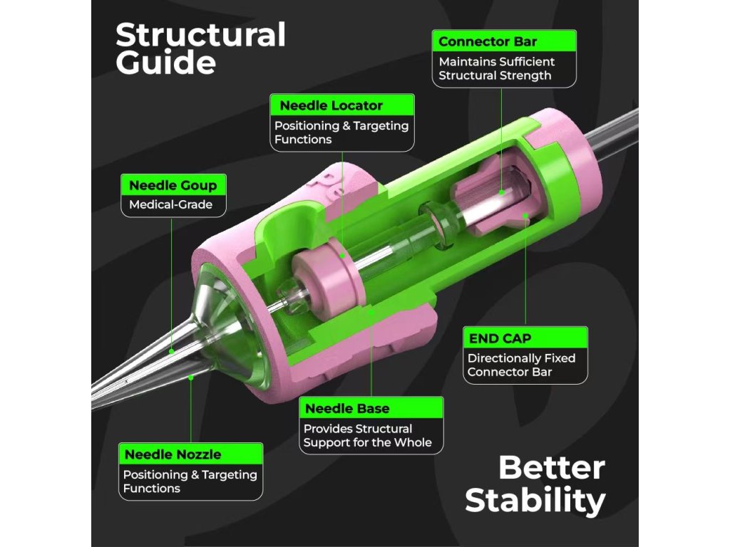 Peach tattoo je popredným výrobcom tetovacích potrieb už od roku 2001 a stal sa jedným z troch najlepších výrobcov v tomto odvetví. Peach cartridge sú dokonalou voľbou pre profesionálnych tattoo umelcov, ktorí hľadajú presnosť, odolnosť a pohodlie. Tieto špičkové cartridge sú starostlivo vyrobené z lekárskej nehrdzavejúcej ocele 304, sterilizované EO plynom, balené jednotlivo v sterilných blistroch a ponúkajú výnimočnú pevnosť a odolnosť proti korózii. Každá kazeta má presné zarovnanie, ktoré zaisťuje, že ihly zostanú odolné voči ohýbaniu a sedia rovno, čo výrazne znižuje traumu kože počas procesu tetovania. Inovácie tým nekončia. Peach tetovacie cartridge majú cielenú silikónovú membránu, ktorá je rovnomerne namáhaná a tým udržuje dráhu ihly pre konzistentné a presné výsledky. Silikónový úchop na prsty je ergonomicky tvarovaný pre pohodlie každého umelca. Cartridge sú univerzálne a kompatibilné s väčšinou tetovacích strojčekov.