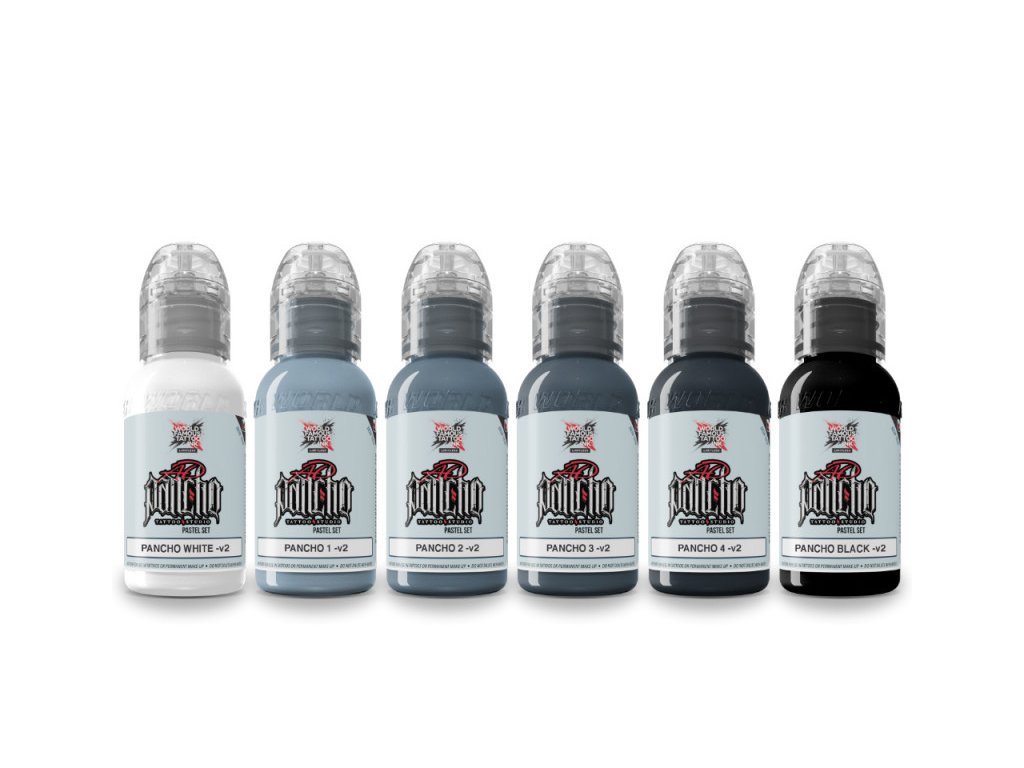 World Famous Limitless - Pancho Pastel Grey Set (6x 30 ml) je perfektný set šiestich farieb, ktoré sú ideálne na použitie pri čiernosivých kompozíciách a portrétoch. Farby majú pastelový odtieň, ktorý je typický práve pre svetového tatéra A.D. Pancha, ktorý tieto tóny namiešal.