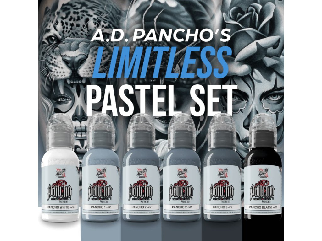 World Famous Limitless - Pancho Pastel Grey Set (6x 30 ml) je perfektný set šiestich farieb, ktoré sú ideálne na použitie pri čiernosivých kompozíciách a portrétoch. Farby majú pastelový odtieň, ktorý je typický práve pre svetového tatéra A.D. Pancha, ktorý tieto tóny namiešal.
